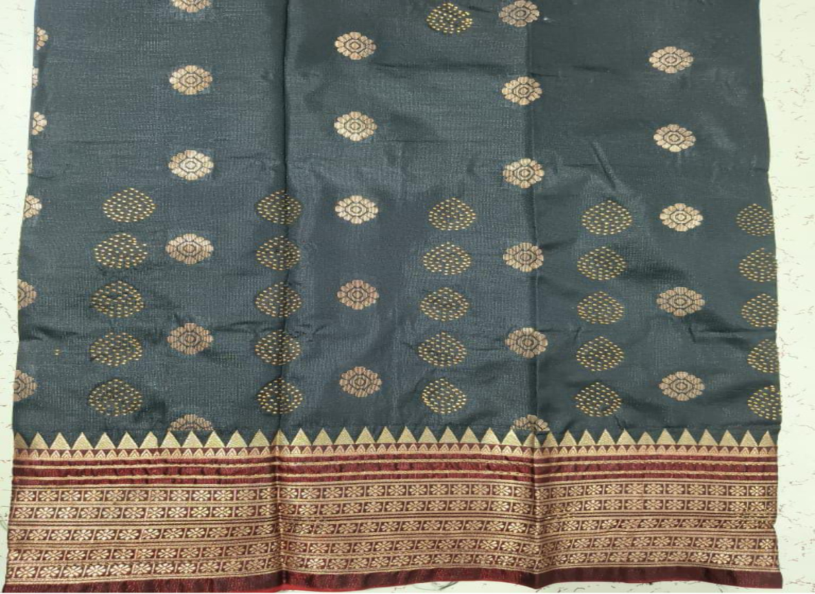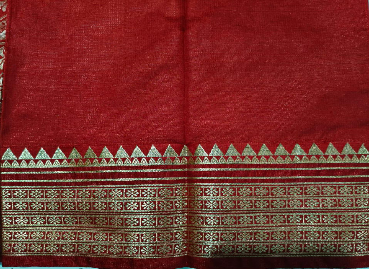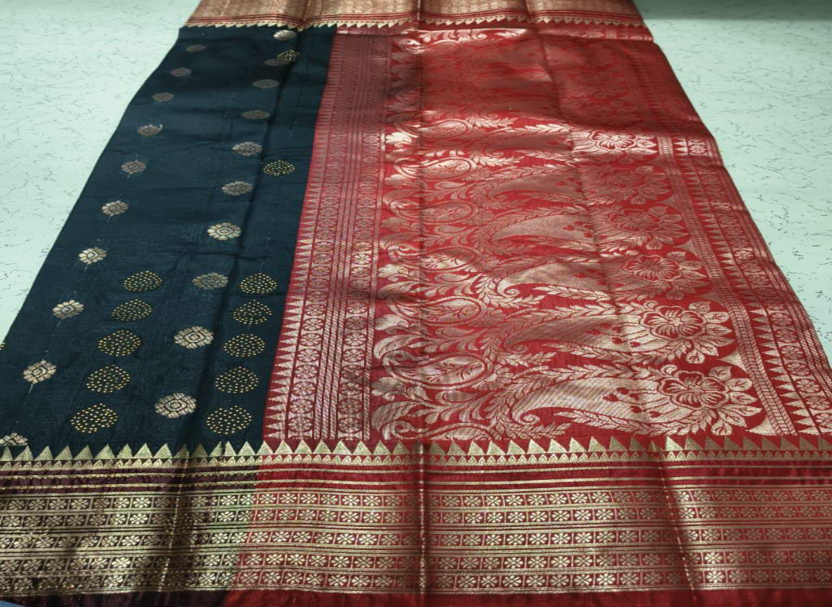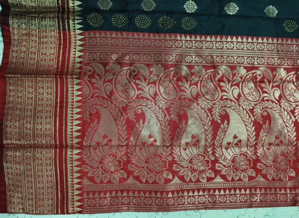 A bold red border and pallu bring a perfect contrast to the dark body. Golden floral and paisley designs shimmer beautifully across the fabric, making this saree ideal for weddings, festive gatherings, and cultural celebrations. The combination of black, red, and gold creates a look that never goes out of style.