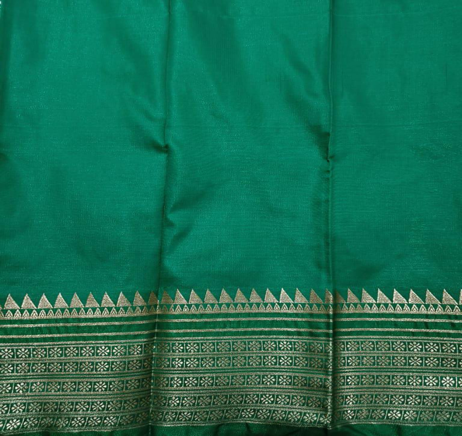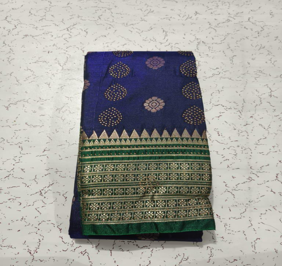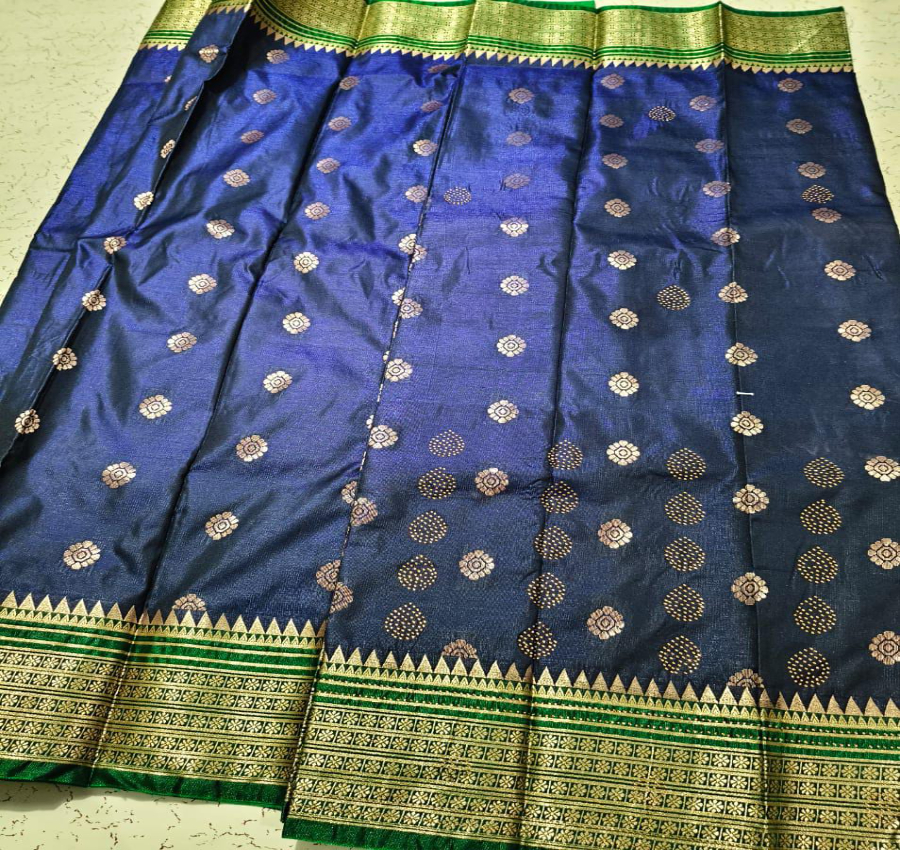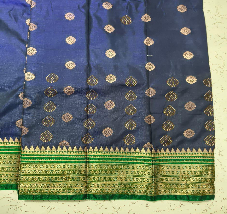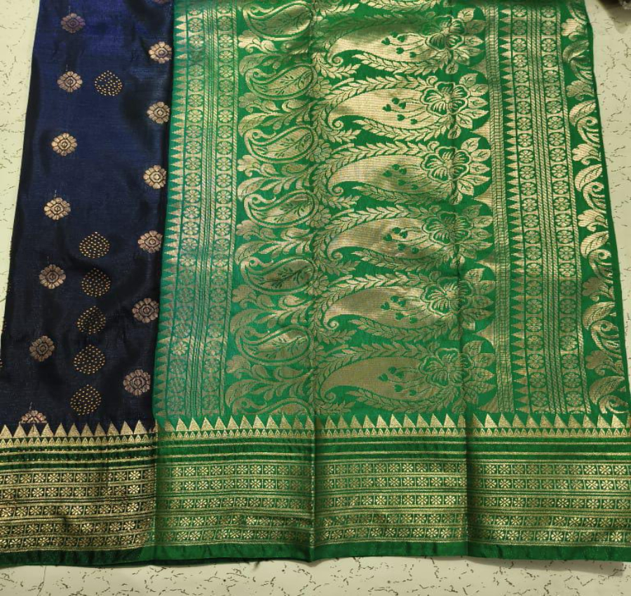 The rich navy blue body of the saree is adorned with delicate gold buttas, creating a subtle yet regal shimmer that captures the eye. The emerald green border and pallu are intricately woven with traditional paisley and floral motifs in shimmering gold zari threads, enhancing the overall opulence of the ensemble. The interplay of dark blue and green hues adds depth and richness, making it a perfect choice for weddings, festive occasions, and traditional ceremonies.