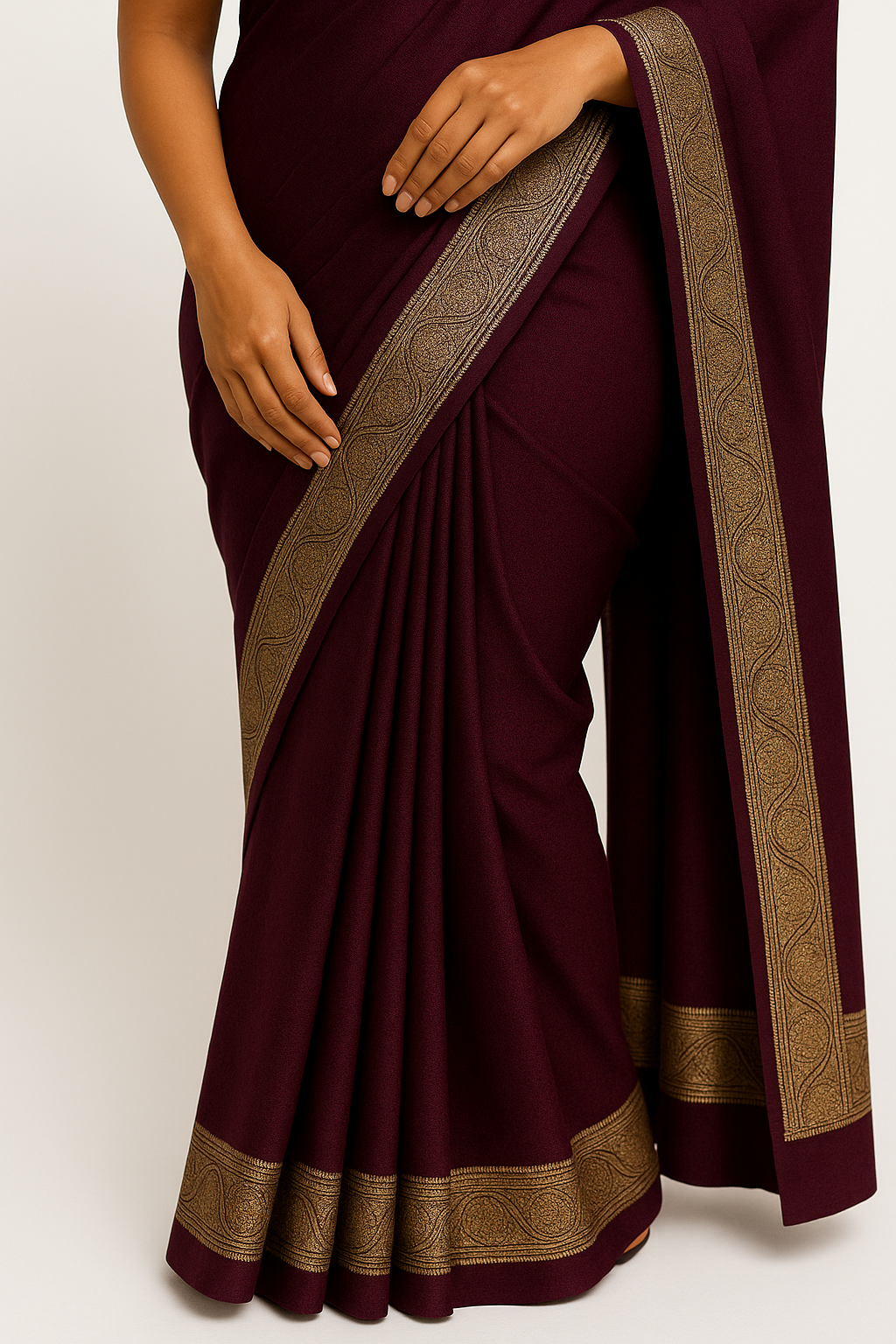 The saree features a beautifully crafted silver zari border and pallu, adorned with intricate circular and floral motifs inspired by traditional Banarasi weaving. The subtle shine of silver threads enhances the deep purple tone, creating a perfect balance between modern style and classical beauty. This elegant saree is ideal for weddings, festive celebrations, family functions, or formal gatherings — wherever you wish to make a refined statement.